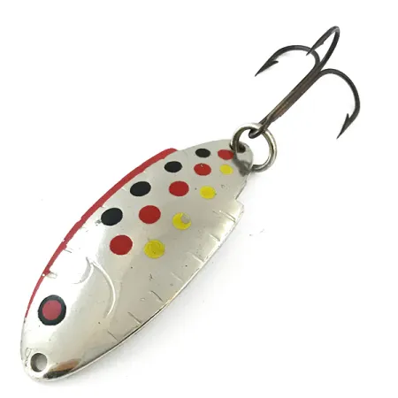 Nikelio danga suteikia pagrindinį blizgesį daugiaspalviam raudonų, juodų ir geltonų taškų raštui, puošiančiam šią 7 g (1/4 oz) blizgę. Kitoje pusėje įspaustas užrašas „THOMAS BUOYANT“ išlieka ryškus ir įskaitomas poliruotame paviršiuje, o tai yra to meto JAV gamybos bruožas. Šis konkretus 4,5 cm (1 3/4") modelis, atpažįstamas pagal prekės kodą 5604, pasižymi charakteringais dantytais kraštais ir ryškiai raudona nugarėle, kuri kontrastuoja su blizgiu nikelio korpusu. Įrangą sudaro tvirtas žiedelis ir tamsios apdailos trišakis kablys, abu išlaikę puikią formą. Įvertintas 5/5 būkle, masalas demonstruoja ryškią, daugiaspalvę apdailą, kurios tikisi kolekcininkai. Dizainas skirtas spiningavimui arba velčiavimui, o svoris subalansuotas specialiai jo vardiniam plūdrumui.