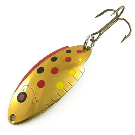 Paauksuoto metalo apatinėje dalyje aiškiai įspaustas „T101“ žymėjimas – konkretus šios 5 g (3/16 oz) Thomas Buoyant blizgės identifikatorius. Šio egzemplioriaus apdaila yra itin paklausus Golden Trout raštas su raudonais, geltonais ir juodais taškeliais ant poliruoto auksinio paviršiaus. 4 cm (1 1/2") dydžio blizgė turi unikalias įpjovas palei apatinį kraštą ir ryškią akies detalę priekinėje dalyje. Šis JAV pagamintas masalas, identifikuojamas prekės kodu 5821, turi aukštos kokybės trišakį kabliuką, pritvirtintą tvirtu žiedeliu. 5/5 būklė matoma iš išlikusių aiškių gamyklinių įspaudų ir nepažeistų dažytų akcentų. Skirta daugiausia spiningavimui gėluose vandenyse, o storas metalas užtikrina didelį tankį lyginant su masalo dydžiu.