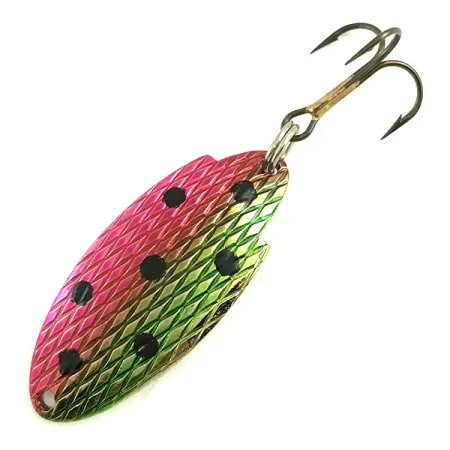 Sidabriniame reverse aiškiai įspaustas modelio žymėjimas T101 identifikuoja šią Thomas Buoyant kaip klasikinį Amerikos žvejybos įrankių istorijos pavyzdį. Šis 3/16 uncijos (5 g) svorio ir 1 1/2 colio (4 cm) ilgio egzempliorius pasižymi išskirtiniu Hammered Rainbow Trout raštu. Priekinės dalies spalvų paletė pereina iš gilios purpurinės rožinės į ryškią laimo žalią, kurią pabrėžia šeši ryškūs juodi taškai ant deimanto formos briaunų. Masalo nugarėlė padengta grynu sidabru, ant jos išspaustas Thomas prekės pavadinimas ir svoris. Bronzinis trišakis kabliukas prie korpuso pritvirtintas tvirtu sidabriniu žiedeliu. Šis konkretus masalas, atpažįstamas pagal produkto kodą 5823, yra 5/5 būklės, išlaikantis ryškų metalinį blizgesį ant visų paviršių. Jo unikali asimetrinė forma būdinga šiai JAV gamintai serijai, skirtai žvejybai lengvais įrankiais.