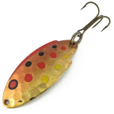 Kaltas auksinis žalvaris sukuria itin atspindintį paviršių Hammered Golden Rainbow Trout spalvinimo schemai, kurią papildo ryškūs raudoni, geltoni ir juodi taškai. Ši JAV pagaminta vartiklė, prekės kodas 6824, yra 5/5 būklės ir neturi jokių naudojimo žymių. 4 cm (1 1/2") ilgio ir 5 g (3/16 oz) svorio metalinis korpusas pasižymi ryškiu lašo formos išlinkimu ir tekstūruota apdaila, užtikrinančia maksimalų blyksėjimą metimo ar velčiavimo metu. Kitoje pusėje aiškiai įspaustas Thomas prekės ženklas, T101 modelio numeris ir Buoyant pavadinimas. Masalas turi tvirtą žiedelį ir bronzuotą trišakį kabliuką, visa originali furnitūra yra puikios būklės.