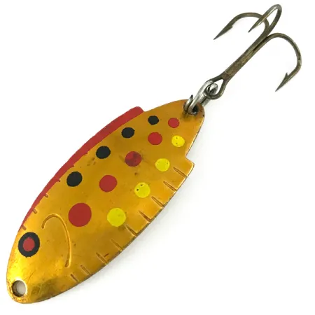 Aukso atspalvio žalvaris sudaro šios 7 g blizgės pagrindą, pasižymintį išskirtine įranta uodegėlėje, būdinga klasikiniam „Thomas Spinning Lure Company“ dizainui. Šio 4,5 cm masalo „Golden Trout“ apdaila yra itin švari, su ryškiais juodais, raudonais ir geltonais taškais, nupieštais ant metalinio aukso paviršiaus, imituojant upėtakio išvaizdą. Įgaubtoje pusėje aiškiai įspaustas modelio T102 ženklas, nurodantis JAV kilmę ir gamybos standartus, siejamus su „Thomas Buoyant“ vardu. Šis egzempliorius, kurio produkto kodas 7195, yra 5/5 būklės, išlaikęs originalų aukštą blizgesį ir ryškias spalvų linijas, įskaitant subtilią reljefinę žiaunų liniją prie kilpelės. Tvirtas žiedelis jungia originalų bronzuotą trišakį kabliuką gale, užtikrinant, kad furnitūra išliktų tokia pat tvirta kaip ir gamybos dieną.