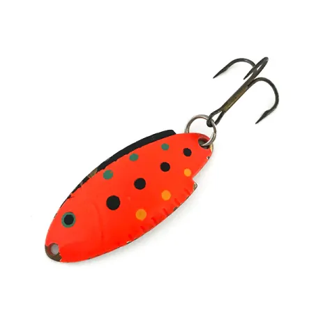 Ši klasikinė 5 g (3/16 oz) vartiklė pasižymi Red Trout raštu ant nikelio pagrindo. 4 cm (1 1/2") metalinis korpusas nudažytas ryškia oranžine-raudona spalva su ryškiais juodais, geltonais ir žaliais taškeliais, sukuriančiais kontrastingą profilį. UV šviesoje masalas skleidžia stiprų oranžinį švytėjimą – tai techninė detalė, skirta žvejybai drumstame vandenyje ar esant prastam matomumui. Šis Thomas Buoyant modelis (kodas 8550) yra puikus JAV gamybos pavyzdys su štampuota nikelio nugarėle ir tvirtu trišakiu kabliu ant žiedelio. Dažai ir furnitūra yra puikiai išlaikyti (būklė 5/5). Šis egzempliorius demonstruoja tradicinius gamybos metodus, skirtus spiningavimui ir velkiavimui gaudant upėtakius bei ešerines žuvis.