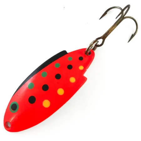 Ant sidabrinės įgaubtos pusės aiškiai išspaustas klasikinis „THOMAS BUOYANT MADE IN USA“ ženklas, patvirtinantis šios vartiklės amerikietišką kilmę. 1 3/4 colio (4,5 cm) profilio masalas sveria universalius 1/4 uncijos (7 g), todėl jis yra puikus pasirinkimas žvejybai lengvais įrankiais. Apdaila – ryškus „Red Trout UV Glow“ raštas: drąsus fluorescencinis oranžinis-raudonas pagrindas, papuoštas žaliais, juodais ir geltonais taškeliais. Masalas, kurio prekės kodas 5393, yra padengtas specialiais dažais, reaguojančiais į UV šviesą, kad būtų geriau matomas esant prastam apšvietimui. Konstrukcijoje naudojamas originalus bronzinio atspalvio trišakis kabliukas, pritvirtintas žiedeliu prie praplatintos uodegos dalies. Vertinant išlaikymą, būklė yra 5/5, o metalinis korpusas pasižymi lygiu, blizgiu paviršiumi.