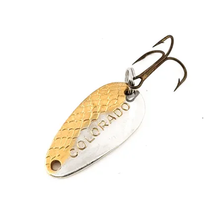 Ši 2,3 cm blizgė, kurios lašo formos kūno auksinėje pusėje įspaustas ryškus žvynų raštas, demonstruoja klasikinį amerikietišką meistriškumą. Thomas Colorado, žymima prekės kodu 12703, pasižymi didelio kontrasto Nikelio / Aukso danga, sukurta atspindėti šviesą įvairiais kampais. Nors oficialus svoris yra 3 g, kolekcininkai pastebės 1/10 oz spaudą kitoje šio JAV pagaminto egzemplioriaus pusėje. Žiedelis tvirtina bronzuotą trišakį kabliuką prie uodegos, išlaikant originalią komplektaciją lengvam spiningavimui. Ši konkreti blizgė yra 5/5 būklės, pasižymi išskirtinai švariais paviršiais ir aiškiu užrašu „COLORADO“ ant nikeliuotos dalies. Thomas Spinner Company logotipas aiškiai matomas nugarėlėje, tarp svorio spaudo ir kabliuko tvirtinimo vietos.