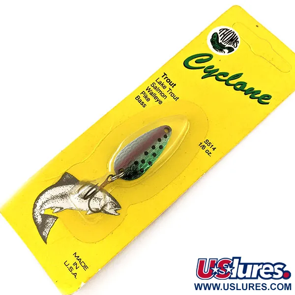 JAV rankomis štampuotas Thomas Cyclone metalinis korpusas sveria 1/8 oz (4,3 g) ir yra 1 1/2" (4 cm) ilgio. Rainbow Trout spalvinimas pasižymi klasikiniais taškeliais ant žaliai rausvo gradiento, skirto imituoti lašišų ir ežerinių upėtakių grobį. Šis 11694 kodu pažymėtas masalas yra nenaudotas ir sandariai supakuotas originalioje geltonoje pakuotėje. Jame sumontuotas vienas bronzuotas trišakis kablys, pritvirtintas tvirtu žiedeliu. Thomas Spinning Lures garsėja savo kokybe, o šis modelis yra puikus amerikietiškos gamybos paveldo pavyzdys.