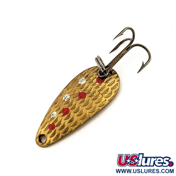 Kaltos žalvario žvyneliai gaudo šviesą ant šio vintažinio egzemplioriaus lašo formos korpuso. 5/5 įvertinimas atspindi puikią jo būklę – paviršius blizgus, be jokių nusidėvėjimo žymių. Iškilioje pusėje virš tekstūrinio žvynelių rašto tiksliai išdėstyti trys raudoni ir trys sidabriniai taškai, sukuriantys išskirtinį vizualinį profilį. Ši 1 1/4" (3 cm) vartiklė turi bronzuotą trišakį kabliuką, pritvirtintą tvirtu žiedeliu uodegoje. Kitoje pusėje yra gamintojo antspaudas su „Cyclone“ pavadinimu ir svorio žyma. Šis 1/8 oz (4,3 g) masalas, identifikuojamas produkto kodu 13155, pagamintas JAV ir turi tiksliai išgręžtą skylutę valui tvirtinti smailėjančiame gale.