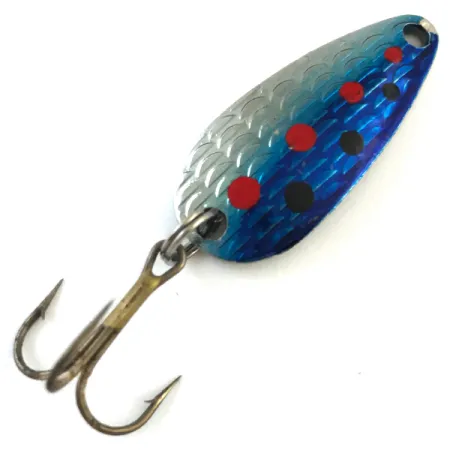 Ši 1/8 oz (4,3 g) sverianti Thomas Cyclone blisgė yra tradicinės Blue Trout spalvos, pasižyminti tekstūruotu sidabriniu žvynų paviršiumi, pereinančiu į tamsiai mėlyną dalį su raudonais ir juodais taškais. Blisgės nugarėlėje aiškiai įspaustas gamintojo pavadinimas, SS14 modelis ir svoris, pabrėžiantis jos kilmę iš JAV. Šis egzempliorius, pažymėtas kodu 5188, turi aštrų trišakį kabliuką ir originalų žiedelį, o jo būklė įvertinta 5/5. 1 1/4" (3 cm) ilgio masalas yra puikiai išlaikytas klasikinės vartiklės dizaino pavyzdys. Metalinis korpusas išlaikė pradinį blizgesį, išryškinantį Cyclone serijai būdingas reljefines žvynų detales.