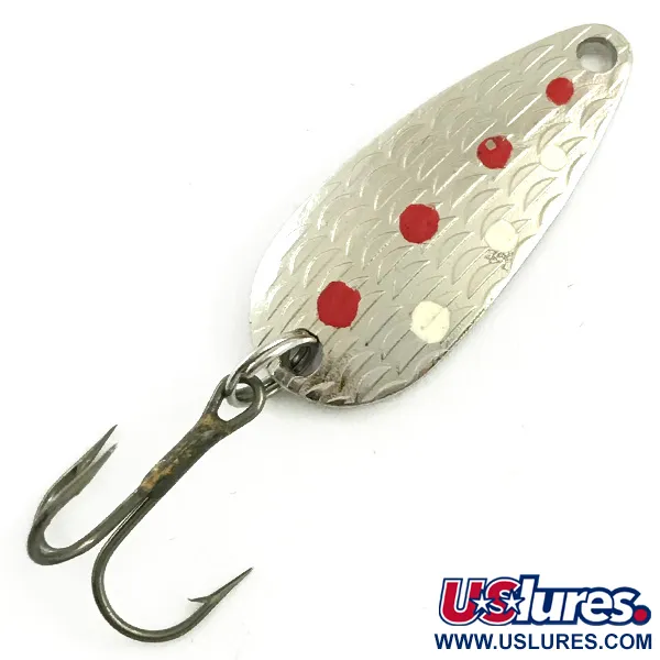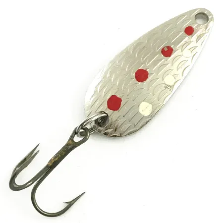 Blizgės nugarėlėje į metalą įspaustas gamintojo pavadinimas ir modelio žymėjimas, patvirtinantis jos kilmę iš JAV. 3 cm (1 1/4") ilgio „Thomas Cyclone“ sveria 4,3 g (1/8 oz) ir pasižymi klasikiniu lašo formos profiliu. Sidabrinės spalvos priekinė dalis yra su giliu žvynų rašto įspaudu ir dekoruota ryškiais raudonais bei baltais taškais. Šis egzempliorius, žymimas prekės kodu 5818, sukomplektuotas su vienu metaliniu trišakiu kabliu. Įvertinus būklę 5/5, blizgė išlaiko švarų, atspindintį paviršių ir ryškias dažytas detales ant tekstūruoto korpuso.