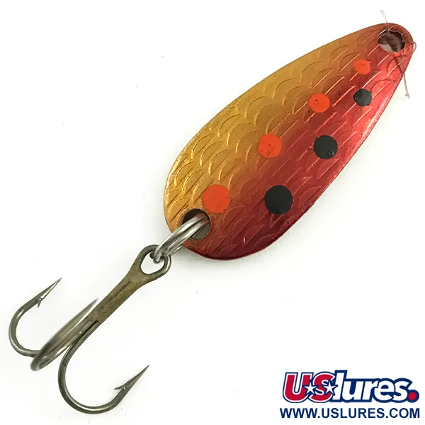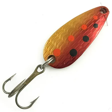 Iškili žvynų tekstūra ant išgaubtos pusės suteikia šiai 3 cm (1 1/4") sūpuoklei unikalų taktilinį paviršių. Rainbow Red Trout / Gold spalvinimo masalas turi auksinį pagrindą, pereinantį į sodrią raudoną spalvą, kurią paįvairina pakaitomis išdėstyti oranžiniai ir juodi taškai. Ši Thomas Cyclone (produkto kodas 5819) yra pagaminta iš žalvario ruošinio, kurio kitoje pusėje įspaustas gamintojo pavadinimas ir „S514“ bei „1/6 oz“ žyma, nors oficialus svoris yra 1/8 oz (4,3 g). Pagaminta JAV, ši sūpuoklė apginkluota ilgaamžiu trišakiu kabliuku, pritvirtintu tvirtu žiedeliu. Būklė vertinama 5/5 – švari gamyklinė apdaila be naudojimo žymių ar oksidacijos. Papildomas tvirtinimo taškas priekyje paliktas tiesioginiam rišimui arba suktukui su segtuku, kas įprasta tiksliam užmetimui skirtiems masalams.