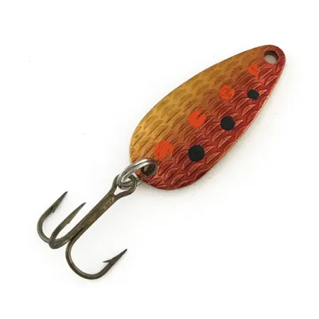 Šios blizgės priekinis paviršius iškaltas gilia žvynų tekstūra ir padengtas ryškia Red Trout apdaila, kuri pereina iš spindinčio aukso į šiltą vario raudonį. Pagal dokumentaciją 1 1/4" (3 cm) ilgio ir 1/8 oz (4,3 g) svorio Thomas Cyclone yra klasikinė JAV pagaminta vilioklė, kataloguose žymima prekės kodu 8306. Kitoje pusėje yra aiškus originalus štampas su gamintojo pavadinimu ir S514 modelio žymėjimu, nors ant paties metalo išgraviruota 1/6 oz reikšmė. Šeši rankomis nudažyti taškai – trys oranžiniai ir trys juodi – suteikia išskirtinį vizualinį kontrastą, būdingą šiam spalviniam profiliui. Blizgė komplektuojama su originalia furnitūra, įskaitant tvirtą žiedelį ir aštrų trišakį kabliuką, jos būklė yra 5/5. Metalo apdirbimo detalumas atspindi aukštą kokybės kontrolę, kurią JAV taiko Thomas kompanija.