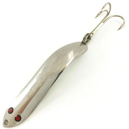 Poliruota nikelio apdaila pasižymi 6 cm ilgio šios senovinės blizgės korpusas, turintis du ryškius raudonus taškus-akis, nupieštus netoli valo tvirtinimo vietos. Priekinėje dalyje įspaustas „EEL“ pavadinimas kartu su detaliu žuvies motyvu, būdingu JAV gamintojo Thomas Lures produkcijai. Nors nurodytas produkto kodas 5657 ir 10 g svoris, kitoje metalo pusėje matomas gamyklinis „3/8 OZ“ įspaudas kartu su modelio numeriu R324 bei prekės ženklo logotipu. Įrangą sudaro tvirtas trišakis kablys, pritvirtintas per žiedelį, be jokių naudojimo žymių. Šis egzempliorius yra puikios 5/5 būklės, išlaikantis veidrodinį spindesį ant savo išlenkto paviršiaus. Masalas yra subalansuotas įvairiems mėtymo ir velčiavimo būdams, kai reikalingas siauras profilis.