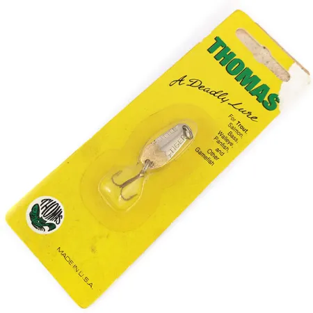 Ši kompaktiška blizgė su tiesiai ant auksu dengto metalo iškaltu „TIGER“ pavadinimu reprezentuoja klasikinę Amerikos žvejybos įrankių dizaino erą. Sverdama 1/8 oz (3,2 g) ir būdama 1" (2,5 cm) ilgio, ji išliko originalioje geltonai žalioje gamyklinėje pakuotėje. Šis Thomas Little Tiger modelis, atpažįstamas pagal prekės kodą 9998, pasižymi ryškia aukso apdaila, skirta atspindėti šviesą metimo ar velčiavimo metu. Ant pakuotės aiškiai nurodyta kilmė – „MADE IN U.S.A.“, o blizgė skirta įvairioms žuvims, nuo ešerinių iki lašišų. Kaip nenaudotas egzempliorius (būklė: 6), masalas išlaikė gamyklinę išvaizdą su originaliu tamsiu trišakiu kabliuku ir skaidria pakuote. Apvalus žalias logotipas apatiniame kairiajame kampe suteikia prekės ženklui klasikinį vizualinį identitetą ryškiai geltoname fone.