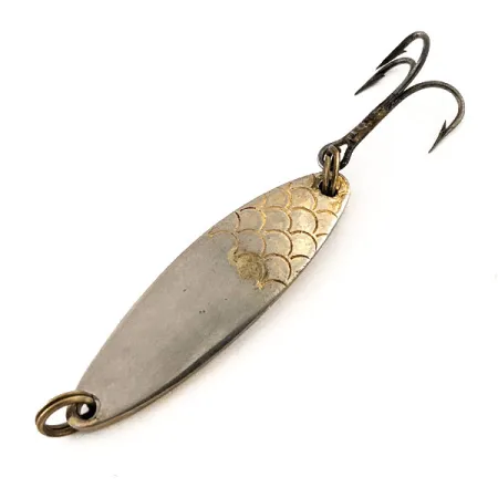 Šios 3,7 cm (1 1/2") ilgio blisgės korpusas padengtas sidabru, o viršutinėje išgaubtos pusės dalyje yra ryškus štampuotas žvynelių raštas. Šis 7 g (1/4 oz) svorio kieto metalo masalas sukurtas tolimiems metimams ir žvejybai giliuose sluoksniuose įvairiuose gėlo vandens telkiniuose. Įgaubtoje apatinėje pusėje aiškiai matomas Thomas logotipas kartu su žuvies piktograma, patvirtinantis JAV kilmę ir praėjusio amžiaus vidurio gamybos paveldą. Masalas ginkluotas vienu trišakiu kabliuku, pritvirtintu tvirtu žiedeliu, o prie jungties su valu yra toks pat žiedelis saugiam montavimui. Šis egzempliorius, pažymėtas prekės kodu 13111, yra 5/5 būklės, išlaikęs blizgų paviršių ir ryškius graviravimus ant viso sidabruoto ploto.