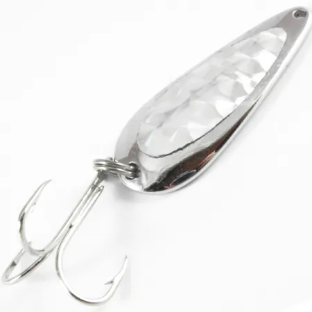 Šios Tony Accetta 3 H nikelio danga ryškiai blizga, gaudydama šviesą savo išskirtiniu tekstūriniu prizminiu paviršiumi. Ši JAV pagaminta blizgė sveria 11 g (2/5 oz), pasižymi klasikiniu lašo formos profiliu, kurio ilgis yra 4,5 cm (1 3/4"). Kolekcininkai įvertins 5/5 būklę, kuri pabrėžia išsaugotą metalo apdirbimo ir furnitūros vientisumą. Konstrukciją sudaro tvirtas žiedelis, sujungtas su aštriu trišakiu kabliuku, specialiai sukurtu spiningavimo technikoms. Šis konkretus egzempliorius, pažymėtas prekės kodu 3728, demonstruoja klasikinį meistriškumą, dėl kurio Accetta tapo neatsiejama vidurio amžiaus žvejybos dėžučių dalimi. Briaunuotas vidinis skydelis sukurtas taip, kad maksimaliai padidintų blyksnius iš įvairių kampų tolygaus traukimo metu.