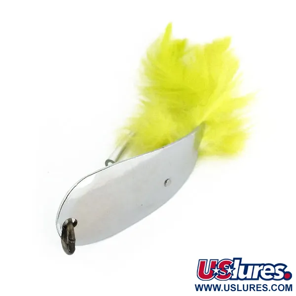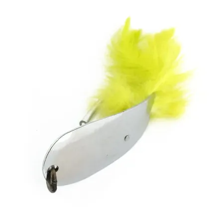 Nikeliuotas paviršius suteikia veidrodinį spindesį šiai JAV gamybos vartiklei – tai esminis dizainas, padedantis atspindėti šviesą įvairiomis vandens sąlygomis. Ši 12 g (2/5 oz) svorio ir 5,5 cm (2 1/4") ilgio Tony Accetta HOBO, žymima prekės kodu 13200, yra tikra praėjusio amžiaus vidurio žvejybos dėžučių klasika. Įgaubtoje masalo pusėje įspaustas gamintojo ženklas ir „Genoa, O.“, rodantys jos kilmę iš JAV. Į dizainą integruotas vienšakis kablys, papuoštas ryškiai geltonomis plunksnomis (hackle), kurios sukuria ryškų kontrastą poliruotam metalui. Kad masalas lengviau judėtų per žoles metimo metu, virš kabliuko smaigalio sumontuota plona vielinė apsauga nuo žolių. Eksponatas yra 5/5 būklės, išlaikęs ryškų blizgesį ant nikeliuotų paviršių ir originalių dalių.