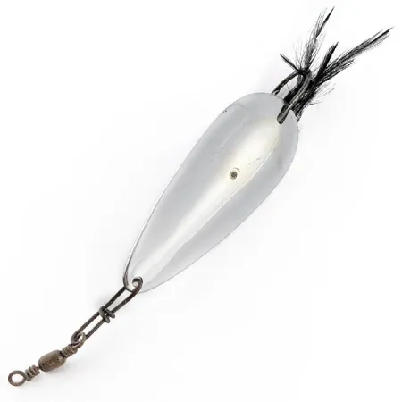 Storas nikelio sluoksnis sudaro šios 21 g (3/4 oz) blizgės pagrindą, užtikrindamas puikų matomumą vandenyje ir atsparumą korozijai. Ši JAV pagaminta „Tony Accetta Weed Doger“, atpažįstama pagal produkto kodą 23270, yra išskirtinė retenybė bet kuriam praeito amžiaus vidurio žūklės įrankių entuziastui. Masalo konstrukcijoje naudojamas vienšakis kablys, apsaugotas standžia vieline apsauga nuo žolių, specialiai pritaikyta metimams į tankią augmeniją ar tarp lelijų lapų. Prie kabliuko kotelio pritvirtintas tamsių plunksnų kuokštas sukuria ryškų siluetą poliruoto metalo fone. Kitoje pusėje ant nikelio paviršiaus aiškiai išspaustas pavadinimas „TONY ACCETTA“. Masalo priekinėje dalyje sumontuotas suktukas, skirtas patogiam tvirtinimui prie valo. Vertinant būklę 4 balais iš 5, šis egzempliorius pasižymi labai švariu paviršiumi, puikiai išlaikyta furnitūra ir ryškiu žymėjimu.