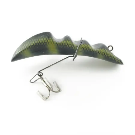 Išskirtinis lydekos raštas su smulkia korėta žvynų tekstūra dengia banguotą šio Bradson masalo kūną. 9,5 cm ilgio ir 12 g svorio masalas pasižymi būdingais išgaubimais, kurie suformuoja unikalų jo profilį. Tamsūs vertikalūs dryžiai ir žalsvai gelsvi tonai padengti ant žvynų imitacijos tinklelio, sukuriant tikrovišką išvaizdą įvairioms žūklės sąlygoms. Furnitūra apima pilvo srityje sumontuotą vielinę konstrukciją, kuri laiko vieną trišakį kabliuką, pritvirtintą centriniu metaliniu laikikliu. Šis konkretus vintažinis Bradson Wave fish (prekės kodas: 23625) yra puikiai išsilaikęs, jo būklė vertinama 5/5 dėl švaraus paviršiaus ir nepažeistos furnitūros. Valo tvirtinimo kilpelė yra pačiame segmentuoto, rantyto korpuso priekyje, kas būdinga išradingiems XX a. vidurio Amerikos masalų inžinerijos sprendimams.