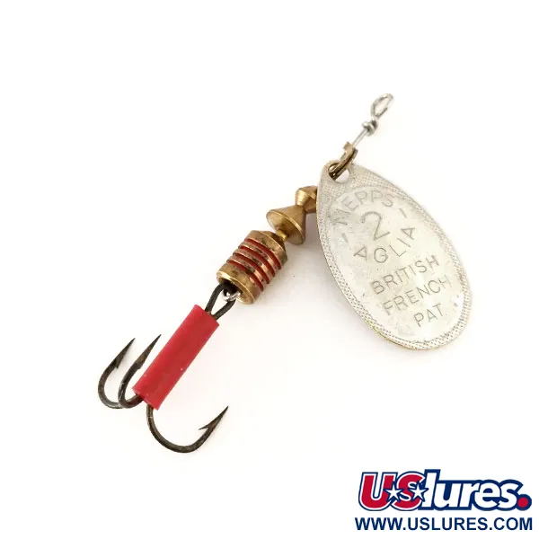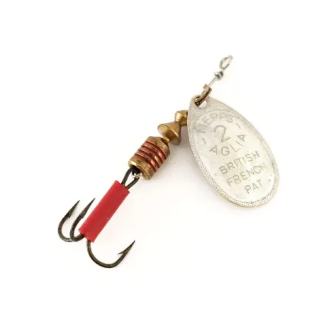 Ant šios 2 dydžio sukrės sidabruoto lapelio įspaustas klasikinis „BRITISH FRENCH PAT“ žymėjimas – tai vidurio amžiaus Mepps gamybos skiriamasis ženklas. 5,5 cm (2 1/4") karkasas turi pasunkintą žalvarinį korpusą, papuoštą keturiais koncentriniais raudonais žiedais, kurie sukuria subtilų vizualinį dirgiklį po vandeniu. 4,5 g (3/16 oz) svorio sistemoje yra trišakis kablys, kurio kotelis apsaugotas ryškiai raudona mova, tarnaujančia kaip fokusuotas puolimo taškas. Šis egzempliorius, pažymėtas produkto kodu 10516, kitoje lapelio pusėje turi „MADE IN FRANCE“ spaudą, atspindintį prekės ženklo kilmę nuo Andre Meulnart 1938 m. išradimo. Sidabrinė apdaila išlieka ryški, o raudoni akcentai išsilaikę itin gerai, todėl šis egzempliorius įvertintas 5/5 būklės balu.