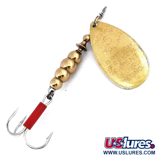 Ant šios 5 dydžio lapelio nugarėlės išspaustas užrašas „MADE IN FRANCE“ pabrėžia europietiškas legendinio dizaino šaknis. Šis žalvario spalvos egzempliorius sveria 1/2 oz (14 g) ir yra 3 1/4" (8 cm) ilgio, reprezentuodamas klasikinę 8-ojo dešimtmečio „Mepps Aglia“ erą. Priekinėje lapelio dalyje giliai išgraviruotas užrašas „MEPPS AGLIA 5“ kartu su Jungtinės Karalystės bei Prancūzijos patentų informacija ir pranešimu apie JAV pateiktą paraišką patentui – tai užuomina į prekės ženklo pasaulinę plėtrą viduryje amžiaus. Ant trišakio kabliuko koto užmautas ryškiai raudonas plastikinis kembrikas tarnauja kaip gerai matomas taikinio taškas žvilgančio auksinio korpuso fone. Patį korpusą sudaro keturi laipsniškai didėjantys žalvariniai karoliukai, užtikrinantys reikiamą svorį metimui ir stabilumą. Šis lašo formos lapelis sukurtas naudoti kūginę rotacijos sistemą, leidžiančią jam laisvai suktis aplink vielinę ašį. Identifikuotas prekės kodu 10601, masalas yra puikiai išlaikytas, įvertintas 4/5 už švarias detales ir aiškiai įskaitomus spaudus. Tai istorinis periodas, kai aukštos kokybės Prancūzijoje pagaminti komponentai buvo surenkami Šiaurės Amerikos rinkai.