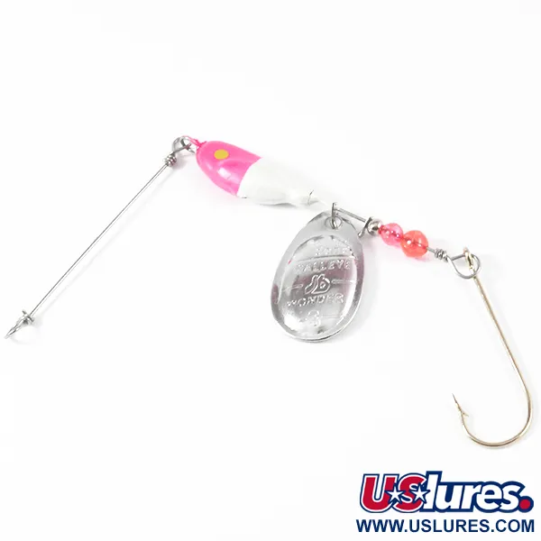 Ant nikeliuotos plokštelės aiškiai išspaustas šio Walleye Wonder 3, produkto kodas 3572, gaminto South Bend, identifikavimo ženklas. 17 g (3/5 uncijos) sveriantis masalas pasižymi išskirtine dviejų tonų galvute su ryškiai rožiniu priekiu, pereinančiu į baltą galinę dalį, akcentuota mažu geltonu akies taškeliu. Konstrukcija atitinka klasikinį „safety-pin“ tipo „spinnerbait“ dizainą, kilusį iš JAV. Tarp 3 dydžio lapelio ir vieno didelio kabliuko vielos rėmelis papuoštas dviem briaunuotais oranžiniai rožiniais karoliukais ir mažais nikelio tarpikliais. Šis egzempliorius yra puikios būklės, įvertintas 5/5, pasižymi švariu dažymu ir blizgančiais metaliniais komponentais. Gyliai įspaustas logotipas ant lapelio išlieka ryškus ir įskaitomas, atspindintis vintažinių South Bend žūklės įrankių gamybos kokybę.