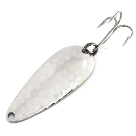 Klasikinės faktūros, šios „vintage“ blikstės kalto nikelio paviršius sukurtas taip, kad po vandeniu sklaidytų šviesą įvairiomis kryptimis. 4,5 cm (1 3/4 colio) ilgio ir 7 g (1/4 uncijos) svorio šis modelis (produkto kodas 9717) atspindi vidurio amžiaus Amerikos žūklės įrankiams būdingą paprastumą ir funkcionalumą. Apvertus masalą, lygiame, poliruotame nugaros paviršiuje matomas giliai įspaustas WEBER prekės ženklas – jų gamybos Stevens Point, Viskonsine, simbolis. Lašo formos korpusas viršuje turi vieną tvirtinimo angą, o gale – tvirtą žiedelį su originaliu trišakiu kabliuku. Masalo būklė yra 5/5, nikelio danga išlieka ryški ir atspindinti šviesą, be jokių žymių nusidėvėjimo ar patamsėjimo požymių. Ši konstrukcija optimizuota standartiniams spiningavimo būdams, kai šviesos atspindžiai yra pagrindinis masalas žuviai.