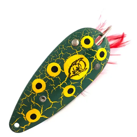 Šis pavyzdys, pasižymintis klasikiniu žaliu suskeldėjusio paviršiaus raštu su geltonomis ir juodomis „varlės“ dėmėmis, demonstruoja ikonišką „Eppinger“ prekės ženklo estetiką. Ši 21 g (3/4 oz) vartiklė yra 7 cm (2 3/4") ilgio – tai universalus dydis gaudant lydekas ar ešerius tankioje augmenijoje. Priekinę dalį puošia centrinis geltonas apskritimas su garsiuoju „Dardevle“ velnio galvos logotipu, pritvirtintu dviem tvirtomis sidabrinėmis kniedėmis. Kitoje masalo pusėje matomas švarus, poliruotas sidabrinis pilvelis su Dearborn, Michigan, vietovės įspaudu, žyminčiu bendrovės istoriją po persikėlimo iš Detroito 1959 m. Kaip bežolė versija (produkto kodas 5434), ji turi vienšakį kabliuką, apsaugotą metaline vielos apsauga ir papuoštą ryškiai raudonų plunksnų kuokštu. Šis konkretus masalas yra nenaudotas ir išskirtinės būklės. Aiškus įspaudas „MADE IN USA“ nugarėlėje liudija Lou Eppingerio vietinės gamybos paveldą, prasidėjusį jo rūsyje dar 1906 m.