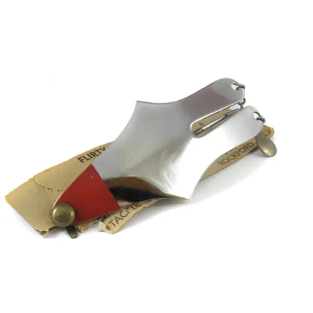 3 1/4" (8,3 cm) ilgio Weedless Flirty Gertie pasižymi išskirtiniu nikeliuotu korpusu su ryškiai raudona priekine dalimi. Ši 3/4 oz (21 g) sverianti masyvi metalinė blizgė buvo sukurta Rockforde, Ilinojaus valstijoje, specialiai žvejybai tankioje augmenijoje. Vienas didelis kablys yra integruotas į nelaidžią žolėms konstrukciją, paslėptą tarp poliruoto korpuso išplatėjusių sparnelių. Pora mažų metalinių lašo formos lapelių pritvirtinti žiedeliais prie galinės dalies, suteikiant subtilių vizualinių elementų traukimo metu. Šis konkretus egzempliorius, pažymėtas prekės kodu 2961, yra nenaudotas (įvertinimas 6). Jis išlikęs ant originalios pakuotės kortelės su gamintojo adresu 1916-20th Ave. Apatinė dalis nudažyta švaria balkšva spalva, kuri kontrastuoja su atspindinčiu nikelio viršumi.