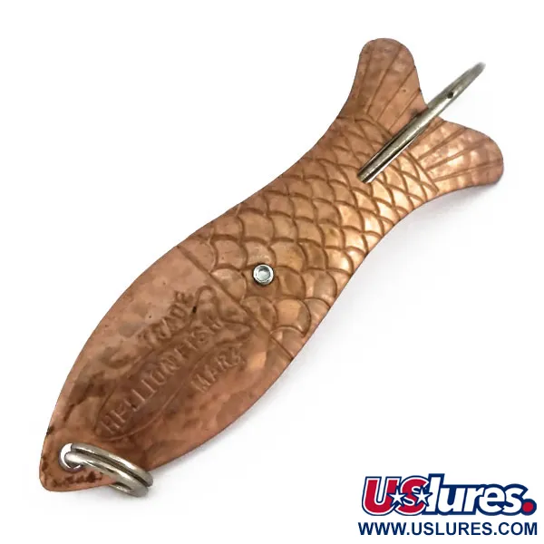 Ant varinio paviršiaus aiškiai išspaustas klasikinis „TRADE HELLION FISH MARK“ ženklas, identifikuojantis šią vintažinę vartiklę. „Weedless Hellion Fish Crystal“, produkto kodas 9729, yra 2 3/4" (7 cm) ilgio ir sveria 2/5 oz (12 g). Ryškiausias jos akcentas – centre esanti „Crystal“ akis, nedidelė įstatyta stiklo akutė, kontrastuojanti su detaliu žvynų raštu, įspaustu metale. Šis JAV pagamintas masalas skirtas žvejybai žolėtose vietose, jis turi tvirtą vielinę apsaugą nuo žolių, kuri saugo integruotą viengubą kabliuką nuo užkliuvimų. Iš profilio matomas gilus vartiklės išlinkimas, derinamas su žuvies uodegos siluetu ir tvirtu žiedeliu valui tvirtinti. Šis konkretus pavyzdys yra 5/5 būklės, pasižymintis švaria, vientisa metalinio korpuso apdaila.