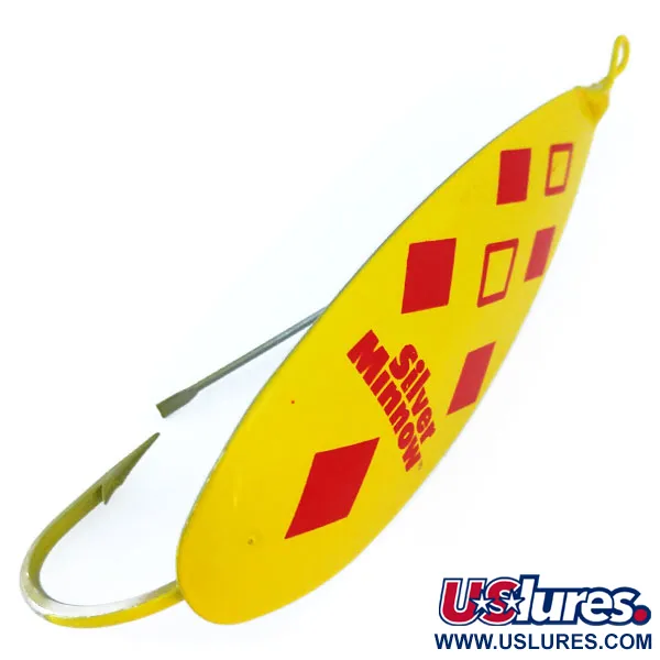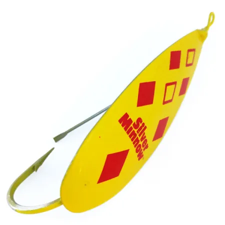 Ryškūs raudoni rombai išsiskiria geltoname fone šiame klasikiniame „Five of Diamonds“ rašto blizgės modelyje. Šis didesnio profilio pavyzdys, kurio ilgis yra 9 cm (3 1/2 colio), o svoris – 28 g (1 oz), yra funkcionalus Louis Johnson originalios 1920 m. dizaino filosofijos pavyzdys. Pagaminta JAV, blizgė sukurta iš specialaus vario ir cinko lydinio, kuris centre yra storesnis. Toks tikslus svorio paskirstymas leidžia masalui išlaikyti nuoseklų svyruojantį judesį 270 laipsnių kampu, o integruotas apsaugotas kablys lieka nukreiptas į viršų, kad būtų galima žvejoti tankioje augalijoje. Kitoje pusėje yra autentiškas sidabravimas – prekės ženklo skiriamasis ženklas, naudojamas ryškiam blyksniui sukurti, siekiant pasiekti žuvis iš apačios ir šonų. Šis konkretus modelis, identifikuojamas pagal prekės kodą 10964, demonstruoja tvirtą vintažinių Amerikos žūklės reikmenų konstrukciją. Masalas yra 5/5 būklės. Tvirtas metalinės vielos apsaugas nuo žolių saugo vienšakio kabliuko smaigalį, kad būtų išvengta užsikabinimų traukiant per tankius vandens lelijų lapus ar nendres.