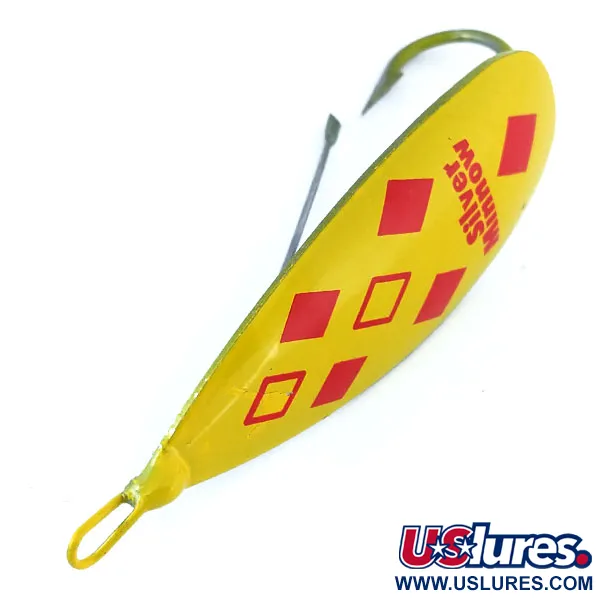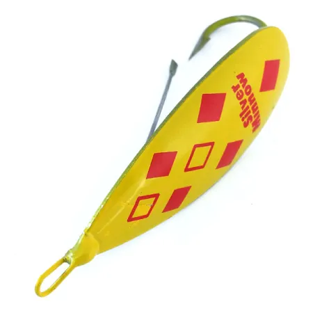 Ryškiai geltona apdaila su penkiais raudonais rombais pasižymi ši Weedless Johnson Silver Minnow blizgė, kurios produkto kodas 11066. 7 cm (2 3/4") ilgio ir 17 g (3/5 oz) svorio blizgė pagaminta iš specialaus vario ir cinko lydinio, o jos centrinė dalis yra storesnė, kad būtų išlaikyta tinkama kabliuko padėtis. Masalo nugarėlėje aiškiai įspausta „JOHNSON'S SILVER MINNOW“ ir „MADE IN U.S.A.“, kas patvirtina, jog tai originalus amerikietiškas vintažinis gaminys. Žolėse nekimbanti konstrukcija turi tvirtą metalinę apsaugą, dengiančią vientisą fiksuotą kabliuką, todėl masalu galima efektyviai žvejoti tarp tankių vandens augalų. Dabartinė būklė vertinama 5/5 – dažyti paviršiai ir metalinė nugarėlė išlieka ryškūs ir tvarkingi. Ši konstrukcija leidžia masalui svyruoti 270 laipsnių kampu, sukuriant ryškius blyksnius, o centre sutelktas svoris užtikrina stabilų darbą nenaudojant papildomų suktukų.