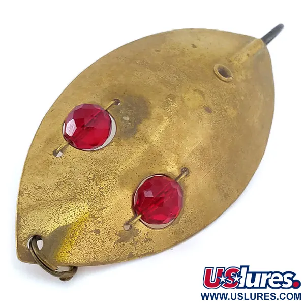 Ši sunki blizgė pasižymi klasikine bronzinio žalvario apdaila ir sveria 2 1/4 uncijos (65 g). Ši JAV pagaminta Hofschneider Weedless Red Eye Muskie, identifikuojama produkto kodu 10850, yra solidaus 4 3/4" (12 cm) ilgio. Konstrukcijos pagrindas – platus metalinis korpusas, akcentuotas dviem ryškiais, briaunotais raudono stiklo karoliukais, kurie atspindi šviesą ir atkreipia dėmesį vandenyje. Sukurta specialiai žvejybai žolėtose vietose, ši blizgė turi integruotą vienšakį kabliuką, apsaugotą vieline apsauga, kad būtų lengviau traukti per tankią augmeniją. Metalinis paviršius pasižymi natūraliu senėjimu, atitinkančiu 4/5 būklės vertinimą, išlaikant struktūrinį vientisumą ir išskirtinę estetiką. Jos dizainas pritaikytas lėtam pravedimui, leidžiant stiklinėms akims išlikti matomoms plėšrūnams traukimo metu. Priekiniame krašte pritvirtintas tvirtas metalinis žiedas saugiam valo prijungimui.