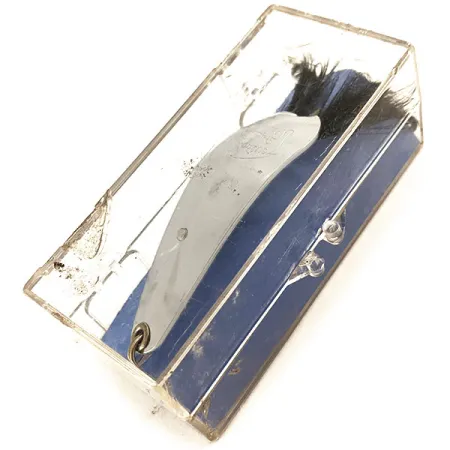 Nikeliavimas suteikia estetišką išvaizdą šiai Weezel Rex Weedless Spoon blizgei – tai 12,5g (2/5oz) metamas masalas, skirtas žvejybai tankioje augmenijoje. Pagamintas Weezel Bait Co. JAV, prieš Eppinger perimant gamybą, šis egzempliorius reprezentuoja specifinę žūklės įrankių gamybos erą. Prekės ženklas, įspaustas tiesiai ant metalo, yra aiškus ir ryškus. 5,5cm (2 1/4") ilgio blizgė turi tvirtą vielinę apsaugą nuo žolių, saugančią kabliuko gėluonį. Galinę dalį puošia juodos plunksnos, sukuriančios išskirtinį profilį, kuris papildo blizgų nikelio paviršių. Produkto kodas 11646 identifikuoja šį nenaudotą gaminį, esantį originalioje skaidrioje dėžutėje su senoviniu mėlynu pagrindu. Metalas ir furnitūra neturi jokių senėjimo ar nusidėvėjimo požymių.