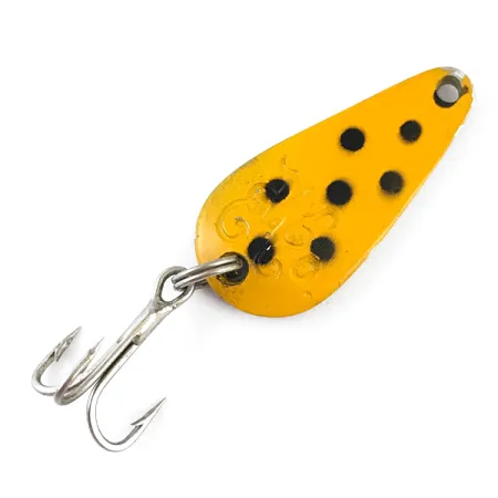 Ši „Weller“ vartiklė su ryškiai geltona apdaila ir šešiais juodais taškais yra puikus XX a. vidurio Amerikos meistriškumo pavyzdys. Kita pusė pasižymi poliruotu nikelio paviršiumi, sukuriančiu ryškų kontrastą su dažyta dalimi. Sveriantis 3,7 g (1/8 oz) ir būdamas 3 cm (1 1/4") ilgio, šis mažo profilio masalas yra universalus įrankis žvejojant upėtakius ar ešerius lengvais įrankiais. Šis konkretus egzempliorius, pažymėtas produkto kodu 4873, pasižymi 5/5 būklės įvertinimu, o originalūs dažai ir furnitūra išliko puikios būklės. Komplektaciją sudaro aštrus trišakis kablys, pritvirtintas standartiniu žiedeliu gale, o priekinė kilpelė yra paruošta tiesioginiam rišimui arba segtukui. Pagamintas JAV, šis „Weller“ masalas atspindi paprastas ir efektyvias konstrukcijas, kurias kolekcininkai vertina dėl jų istorinės reikšmės Amerikos metalinių masalų evoliucijoje. Subtilios reljefinės detalės ant dažyto paviršiaus suteikia tekstūrą, būdingą šioms klasikinėms štampuotoms metalinėms vartiklėms.