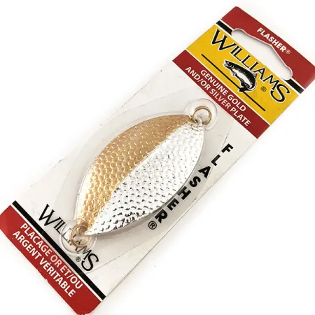 Tikras 24 karatų aukso ir sidabro padengimas dengia šios Kanadoje pagamintos blizgės nukaltą paviršių, užtikrindamas dviejų tonų blyksnius, skirtus geram matomumui įvairiomis vandens sąlygomis. 7 cm (2 3/4") ilgio ir 9 g (1/3 oz) svorio Williams Flasher F1 turi centrinę stabilizavimo briauną, padedančią išlaikyti tolygų judėjimą lėtai traukiant. Šis egzempliorius turi prekės kodą 11670 ir yra nenaudotas, išlikęs originalioje senovinėje pakuotėje iš Šerbruko, Kvebeko. Gamintojas rekomenduoja tai montuoti kaip vilioklį, po kurio seka 30,5–61 cm (12"–24") pavadėlis iki mažesnio masalo – tokia sistema dažnai naudojama gaudant ežerinius upėtakius arba lydekas. Kiekvienas techninis elementas, įskaitant brangiųjų metalų apdailą ir įspaustą prekės ženklo pavadinimą, pabrėžia Williams prekės ženklo kokybę.