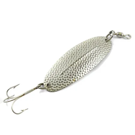 Kaltas sidabro padengimas apibrėžia šios klasikinės Williams Wabler blizgės paviršių – tai dizaino sprendimas, kuris dėl duobėtos tekstūros maksimaliai padidina šviesos atspindėjimą. Ši 8,3 cm (3 1/4") blizgė, pažymėta produkto kodu 1201, turi ikonišką iškilią išilginę briauną – konstrukcinį elementą, sukurtą išlaikyti stabilumą tiek greito, tiek lėto traukimo metu. Šis 18,9 g (2/3 oz) pavyzdys atrodo itin švariai su tikro sidabro apdaila, o jo būklė vertinama 5/5. Iš pradžių skirta lydekų ir standartinių Starkių žvejybai, blizgė komplektuojama su tvirtu trišakiu kabliu ir gamykliškai pritvirtintu suktuku, neleidžiančiu susisukti valui. Šis JAV pagamintas masalas pasižymi patvariu padengimu ir funkcionalia geometrija, kurią kolekcininkai sieja su Williams prekės ženklu.