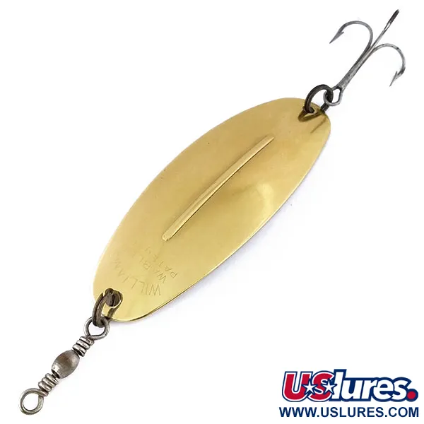 Išskirtinė išilginė briauna apibrėžia šios 10 cm (4") auksuotos vartiklės profilį. Šis Williams Wabler W70 modelis, identifikuojamas pagal prekės kodą 10713, demonstruoja meistriškumą, prasidėjusį Bafale 1914 m., kol gamyba persikėlė į Kanadą. 28 g (1 oz) svorio sunki konstrukcija yra padengta sodriu aukso tonu, išlaikanti 5/5 būklės įvertinimą su ryškiu, švariu paviršiumi. Įspaustas prekės ženklas priekinėje dalyje išlieka aštrus ir įskaitomas, o tai liudija kokybišką gamybą. Šis modelis sukurtas išlaikyti stabilumą tiek greito, tiek lėto traukimo metu – tai techninis pasiekimas, pasiektas dėl unikalios struktūrinės briaunos. Vartiklė komplektuojama su dideliu trišakiu kabliuku ir suktuku, skirta didelių lydekų ar sterkų žvejybai. Nuo 1978 m. šie masalai gaminami išskirtinai Kanadoje, o šis egzempliorius atspindi ilgametį meistriškumo paveldą apdirbant metalą. Aukso apdaila užtikrina gerą matomumą įvairiomis vandens sąlygomis ir išlieka nepriekaištingos būklės.