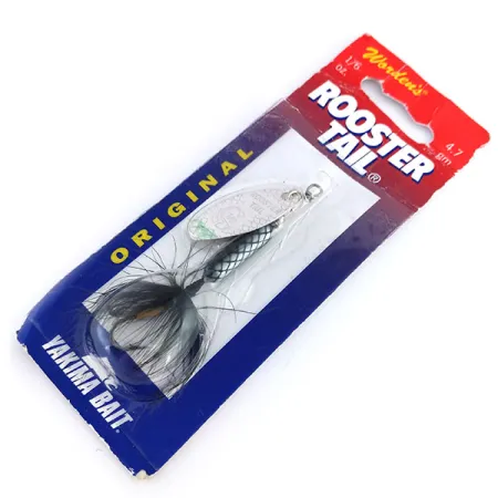 Nikliuoti gluosnio lapo formos lapeliai kartu su tankiomis juodomis plunksnomis išskiria šį konkretų Yakima Bait masalą. Šis 9836 modelis, sveriantis 4,7 g (3/16 oz) ir esantis 7 cm (2 3/4") ilgio, yra tikras Worden’s Original Rooster Tail paveldo paminklas. Howard Worden Viskonsine sukurtas dizainas pasižymi ypatingu efektyvumu upėtakių upeliuose, kuriuose yra didelis žvejybinis spaudimas, o tai lemia lieknas profilis ir natūralus uodegos plaukelių judėjimas. Šis egzempliorius pateikiamas originalioje pakuotėje ir yra nenaudotas. Atidžiai įsižiūrėję į sidabrinį lapelį, pamatysite aiškiai įspaustą ikonišką prekės ženklą, atitinkantį klasikinę sukriukės konstrukciją, kuri yra neatsiejama Amerikos žvejų dėžučių dalis nuo šeštojo dešimtmečio. Balto kartono nugarėlėje pateikiama standartinė Yakima Bait identifikacija ir kilmė, patvirtinanti šio masalo, kaip puikiai išlaikyto kolekcinio eksponato, statusą.
