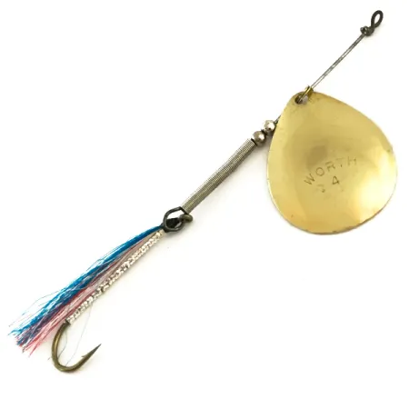 Ant žalvario spalvos lapelio aiškiai išspaustas „WORTH 4“ žymėjimas, identifikuojantis šią klasikinę Amerikoje pagamintą sukrę. „Worth“ kompanija, siejama su kokybiškais žūklės komponentais, sukūrė šį 6285 modelį su lašo formos lapeliu, kuris sukasi ant tvirtos vielinės ašies. 10 cm (4 colių) ilgio ir 3,5 g (1/8 uncijos) svorio masalas turi korpusą, pagamintą iš išskirtinės metalinės spyruoklės ir poros mažų tarpinių karoliukų. Žalvarinė lapelio apdaila suteikia ryškų, atspindintį paviršių, kuris kontrastuoja su rankomis surištu blizgučių (tinsel) papuošimu ant galinio vienšakio kabliuko. Šį papuošimą sudaro mėlynos, baltos ir rausvai raudonos blizgučių gijos, pritvirtintos juodu siūlu. Dabartinė masalo būklė įvertinta 5/5: viela ir kablys išlieka tiesūs, o detalės pasižymi ryškiu blizgesiu.