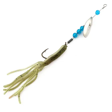 Nikelio ir mėlynos spalvos komponentai apibūdina 20140 modelio išvaizdą, atspindinčią klasikinį „Worth“ amerikietiškos žūklės įrangos dizainą. 11 cm ilgio ir 6 g svorio masalas pasižymi išskirtine „June Bug“ konstrukcija, kurioje lapelis sumontuotas ant vielinio rėmelio. Žvejai vertina šią konstrukciją dėl patikimo užsivedimo, užtikrinančio sklandų nikeliuoto lapelio sukimąsi be strigimų. Sistemėlė papuošta trimis briaunotais mėlynais karoliukais po lapeliu ir vienu tokiu pačiu karoliuku prie valo tvirtinimo kilpelės, sukuriant vizualų kontrastą metalo blizgesiui. Minkšto plastiko uodegėlė, permatomos alyvuogių žalios spalvos su juodais taškeliais, sukuria subtilų faktūrinį profilį už metalinių dalių. Vienšakis kablys tvarkingai integruotas į minkštą kūnelį, o visas rinkinys išlieka 5/5 būklės su švariais paviršiais ir puikiai išlaikytomis medžiagomis. „Worth“ dizainas specialiai sukurtas technikoms, kurioms reikalingas stabilus blyksėjimas ir tolygus sukimasis.