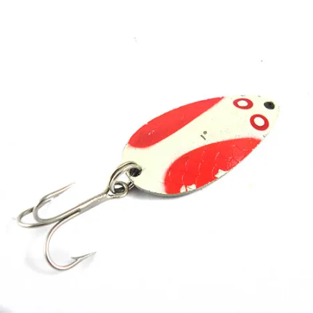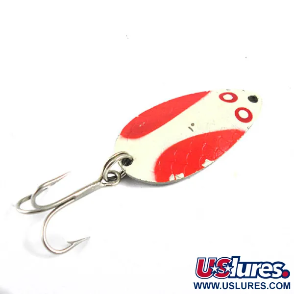 Ši 1 1/2" (3,5 cm) ilgio vartiklė pasižymi išskirtiniu raudonos ir baltos spalvos raštu dažytu paviršiumi, kurį papildo žvynelius primenančios detalės ir raudonos apvalios akys prie galvutės. Wright & McGill Pay-Master, žymimas prekės kodu 0941, yra vidurio amžiaus Amerikos žvejybinių dėžučių klasika. Kitoje masalo pusėje matoma poliruota nikelio apdaila, kurioje giliai metale įspaustas prekės pavadinimas ir 1/4 oz (7 g) svoris. 4/5 būklės masalo dažai išlieka ryškūs, o furnitūra, įskaitant trišakį kabliuką ir žiedelį, yra gerai išsilaikiusi. Šios vartiklės pagrindą sudaro lašo formos metalinis ruošinys, suteikiantis reikiamą svorį metimams į kibimo zoną. Kiekviena detalė – nuo aiškaus spaudo nugarėlėje iki specifinio dažymo – atspindi JAV kadaise vyravusius gamybos standartus. Galvutės tvirtinimo taškas yra tvarkingai išgręžtas, skirtas standartiniams žiedeliams ar segtukams.
