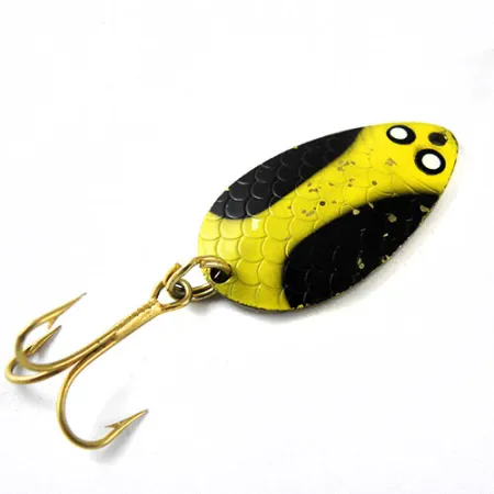 Žalvarinėje nugarėlėje aiškiai įspaustas užrašas „WRIGHT & McGILL 'PAY-MASTER' 1/4 OZ“ patvirtina šios blisgės amerikietišką kilmę. 3,5 cm (1 1/2") ilgio masalas pasižymi ryškiu geltonos ir juodos spalvos žvynelių raštu, primenančiu bitę, kurį papildo dvi ryškios baltos akys galvos srityje. Sunki žalvarinė konstrukcija užtiktina 7 g (1/4 oz) svorį, reikalingą tolimiems metimams. Šis konkretus modelis (kodas 1054) yra puikios 4/5 būklės, dažai išlaikė savo ryškumą, o originalus trišakis kablys yra su auksine apdaila. Istoriškai „Wright & McGill“ naudojo šią tekstūrinę žvynelių apdailą, kad ji atspindėtų šviesą po dažytu paviršiumi. Furnitūra, įskaitant jungiamąjį žiedelį ir kabliuką, yra švari ir tvirtai pritvirtinta.