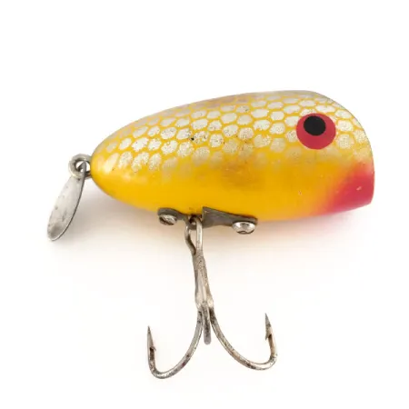 Šis 4,5 cm (1 3/4 colio) ilgio kompaktiškas paviršinis masalas puikiai tinka žūklei lengvais įrankiais. Žinomas kaip Wright & McGill Rustler, šis 10 g (1/3 uncijos) masalas turi produkto kodą 9813 ir yra skirtas 0 m gyliui arba labai sekliam pravedimui. Korpusas pasižymi ryškiai geltona apdaila su korio formos žvynelių raštu, kuris jungiasi su išskirtine juoda įgaubta priekine dalimi. Raudona spalva dengia apatinę dalį po galva ir supa didelius juodus vyzdžius. Uodegoje pritvirtintas nedidelis metalinis lapelis, suteikiantis papildomą blyksnį, o pilvo dalyje per specialią metalinę plokštelę sumontuotas vienas trišakis kabliukas. Šis egzempliorius įvertintas 5/5 būkle, išlaikant klasikinę senosios JAV gamybos estetiką.