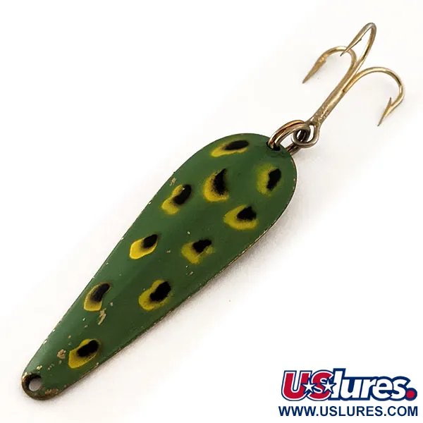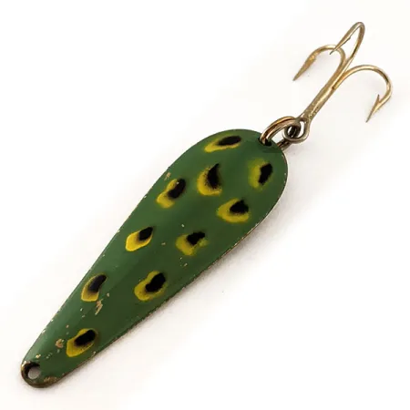 Šios 4,5 cm (1 3/4 colio) lašo formos blizgės pagrindą sudaro žalvario konstrukcija. Metalinėje nugarėlėje aiškiai įspausti Wright & McGill ir Streamliner pavadinimai leidžia tiksliai identifikuoti šį modelį pagal prekės kodą 11704. Priekinė dalis padengta tradiciniu „Frog“ raštu: tamsiai alyvuogių spalvos pagrindas papuoštas juodomis dėmėmis su geltonais apvadais, kurie imituoja natūralų grobį. 7 g (1/4 uncijos) svorio masalas turi aukso atspalvio trišakį kabliuką, pritvirtintą jungiamuoju žiedeliu platesnėje korpuso dalyje. Šis JAV pagamintas žūklės įrankis vertinamas 5/5 balais: emalio dažai išlaikė savo pirminį spindesį, o žalvarinė nugarėlė atrodo švari ir ryški. Susiaurėjimas link valo tvirtinimo kilpos rodo, kad ši blizgė skirta spiningavimui arba velčiavimui įvairiuose gėlo vandens telkiniuose.