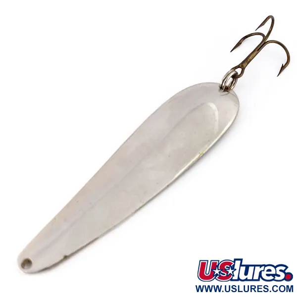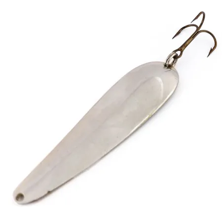 Wright & McGill pavadinimas ir modelio žymėjimas Streamliner yra aiškiai įspausti į įgaubtą metalo pusę šioje klasikinėje 7,5 cm blizgėje. Blizgančia nikelio apdaila nupoliruotas 18 g korpusas efektyviai atspindi šviesą, o tai yra Kolorado valstijoje gaminamų masalų skiriamasis bruožas. Šis egzempliorius, kurio produkto kodas 9602, yra išskirtinės būklės – 5/5 įvertinimas už švarius paviršius ir gerai išsaugotą furnitūrą. Galinėje dalyje tvirtas žiedelis laiko vieną trišakį kabliuką. Profilis elegantiškai smailėjantis, platėjantis link kabliuko, kad pasislinktų svorio centras. Šis JAV pagamintas Streamliner yra tvirtas vidurio amžiaus žūklės įrankių dizaino pavyzdys, pasižymintis lygiu išorės paviršiumi, kontrastuojančiu su detaliu gamintojo spaudu kitoje pusėje.