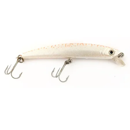 Tekstūruota perlamutrinė apdaila suteikia šiam Yo-Zuri Monnow (S) subtilaus švytėjimo, kurį papildo ryškus oranžinis skeleto raštas išilgai nugaros. Šis 10 g (1/3 oz) svorio skęstantis „minnow“ tipo vobleris iš Japonijos sukurtas įvairioms mėtymo ir „twitching“ technikoms. 9 cm (3 1/2") ilgio korpusas (produkto kodas 13150) turi trumpą, skaidrų liežuvėlį, skirtą darbui seklumose, kol voblerio skendimo savybės leidžia pasiekti skirtingus gylius. Kolekcionieriai įvertins tikroviškas sidabrines akis ir originalius sidabruotus trišakius kabliukus. Šis egzempliorius yra nenaudotas, atrodo lygiai taip pat, kaip išėjęs iš gamyklos. Tai patikimas pasirinkimas gaudant ešerius ir lydekas, demonstruojantis Yo-Zuri/Duel gaminių tikslumą.