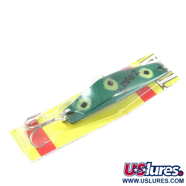 Sodri žalia spalva yra Z-Ray Model 120 pagrindas, pasižymintis ryškiais geltonai žaliais apvadais ir juodais viduriais, sudarančiais Varlė raštą. Ši 1/4 oz (7 g) blisgė yra pagaminta JAV, Z-RAY Lures kompanijos, o jos ilgis siekia 2 colius (5 cm). Produktas, kurio kodas 2561, yra nenaudotas ir išlikęs originalioje skaidrioje lizdinėje pakuotėje. Metalinis korpusas turi aiškų Z-RAY įspaudą ir yra sukomplektuotas su standartiniu trišakiu kabliuku. Pakuotės kortelė gerai išsilaikiusi, su klasika tapusia raudona ir geltona grafika, brūkšniniu kodu bei produkto informacija.