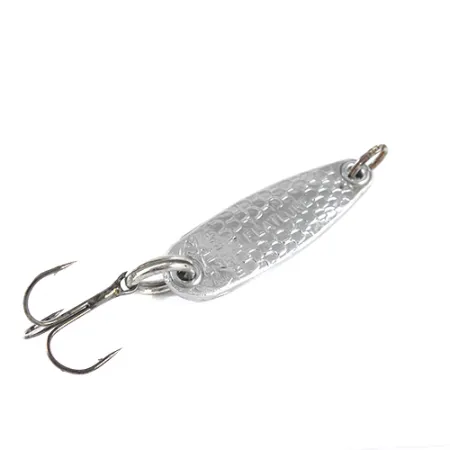 Ši 44 g sverianti Zip Flatlure su išraiškingu žvynų raštu ant metalinio korpuso yra tvirtas JAV gamybos vertikalaus džigavimo masalas. 6 cm ilgio masalas pasižymi poliruotu sidabriniu paviršiumi, kuris išryškina tekstūrą. Iškalti užrašai „FLATLURE“ ir „TRADE MARK“ metalo šone išlieka aiškūs, identifikuojantys šį konkretų JAV pagamintą modelį (produkto kodas 1694). Šis egzempliorius yra 5/5 būklės, pasižymi ryškiu paviršiumi ir puikiai išlaikyta furnitūra, įskaitant originalius žiedelius. Prie uodegos pritvirtintas vienas trišakis kablys, skirtas giliavandeniui džigavimui arba tolimo metimo technikoms.